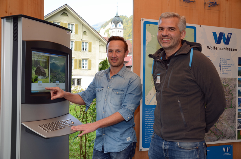 Die neue touristische Erlebnisregion Engelbergertal ist in Wolfenschiessen auch visuell sichtbar. Thomas Vetterli (links) und Frédéric Füssenich testen den Monitor beim Informationsstand beim Bahnhof Wolfenschiessen.